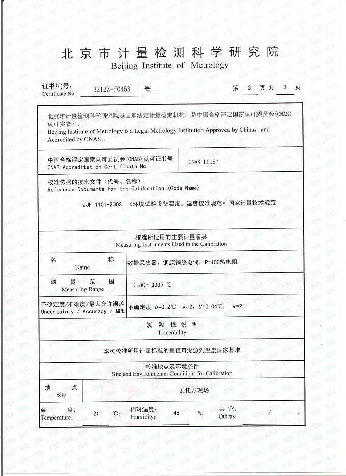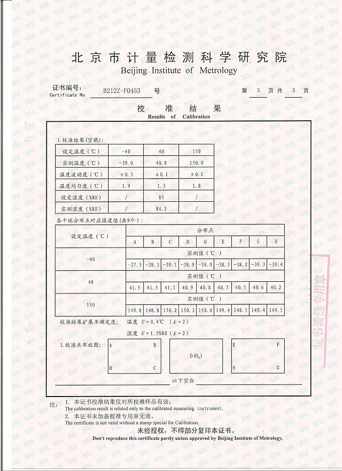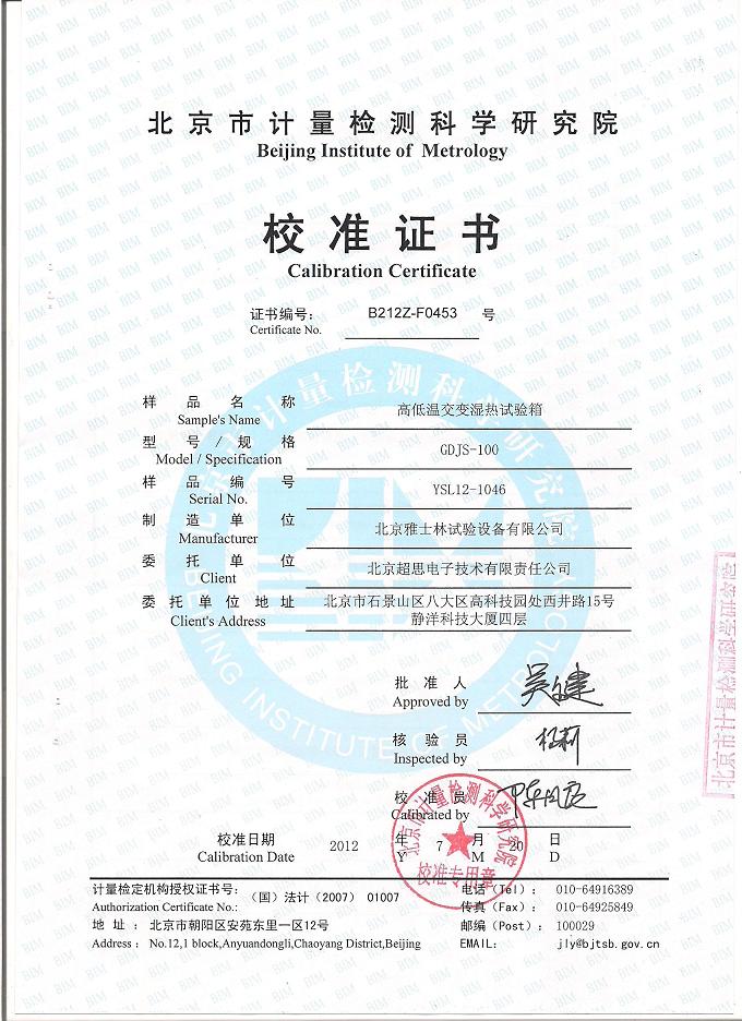 高低溫交變濕熱試驗(yàn)箱校準(zhǔn)證書(shū)-北京計(jì)量院-超思電子