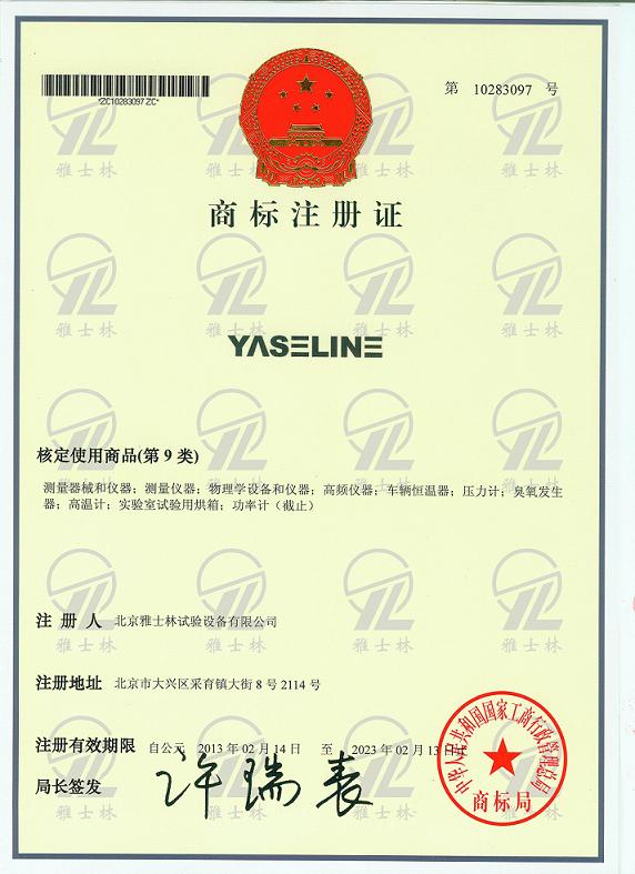 近日,北京雅士林試驗設備有限公司(以下簡稱“雅士林儀器”)注冊的“YASELINE”英文商標,獲得國家工商行政管理總局商標局注冊通過。此次注冊通過的“YASELINE”商標為雅士林儀器近年來全力打造高端試驗箱品牌。