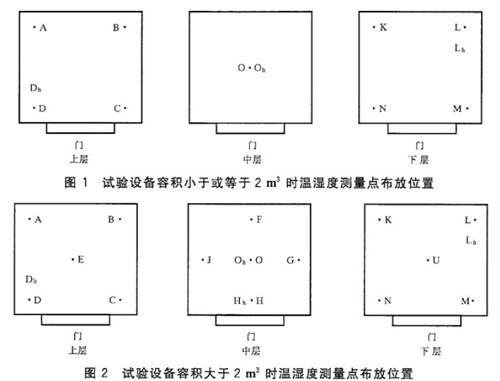 恒溫恒濕試驗箱濕度測量儀器采用干濕球溫度計或由其他濕度傳感器組成的濕度測量系統(tǒng),其測量結果的擴展不確定度不大于被測溫度允許偏差的1/3。 恒溫恒濕試驗箱濕度測量點數(shù)量及位置要求: 一,根據(jù)試驗設備容積的大小,將工作空間分為上、中、下三層,中層通過工作空間幾何中心點,將一定數(shù)量的相對濕度傳感器布放在其中規(guī)定的位置上,傳感器不應受冷熱源的直接輻射。 二、相對濕度測量點用Oh、Dh、Hh、Lh表示。Oh位于中層的幾何心心,其他各測量點與試驗設備內壁的距離為各自邊長的1/10,但最大距離不大于500mm,最小距離不小于50mm。 三、恒溫恒濕試驗箱容積小于或等于2m3時,相對濕度測量點為3個,如圖1所示。試驗箱容積大于2m3時,相對濕度測量點為4個,如圖2所示。當試驗箱容積小于0.05 m3或大于50 m3時,可適當減少或增加測量點。 四、每5min溫度平均變化速率測量點為工作空間幾何中心點。