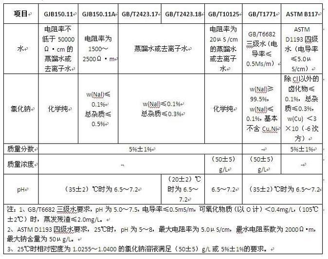 在鹽霧試驗(yàn)箱不同標(biāo)準(zhǔn)中對(duì)鹽霧試驗(yàn)用的鹽溶液有不同的要求,見下表:
